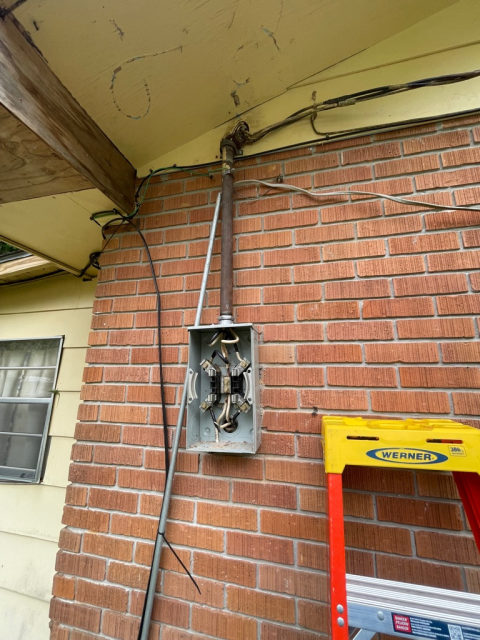 Inspected electrical service reported to be damaged during a recent storm. Upon arrival, it was observed that prior repairs had been made by an outside party. Repairs were not up to code or company standards. As policy does not permit pulling permits for work performed by others, a quote was provided for a complete and code-compliant repair. Scope of work includes rebuilding the electrical service, securing the A/C wiring, and installing 3/4" conduit for the A/C unit.