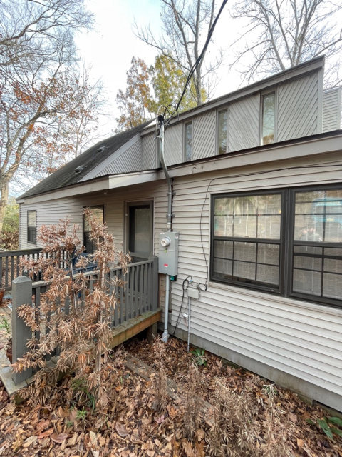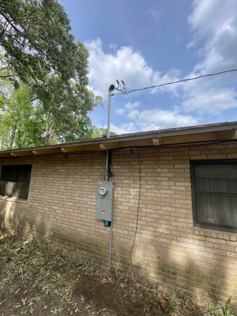 Responded to rebuild a service that had collapsed following rainfall. Inspection revealed heat damage to the existing equipment, indicating imminent failure. A 200A meter/panel combination was selected for replacement. The new unit was repositioned to meet current code height requirements. The existing interior panel was re-fed and unbonded as required. Following installation, the work passed inspection. Utility company (DEMCO) arrived shortly after, and final connections were completed. Power was tested and verified to be functioning correctly.